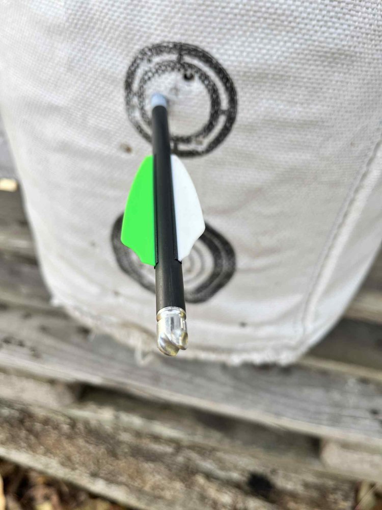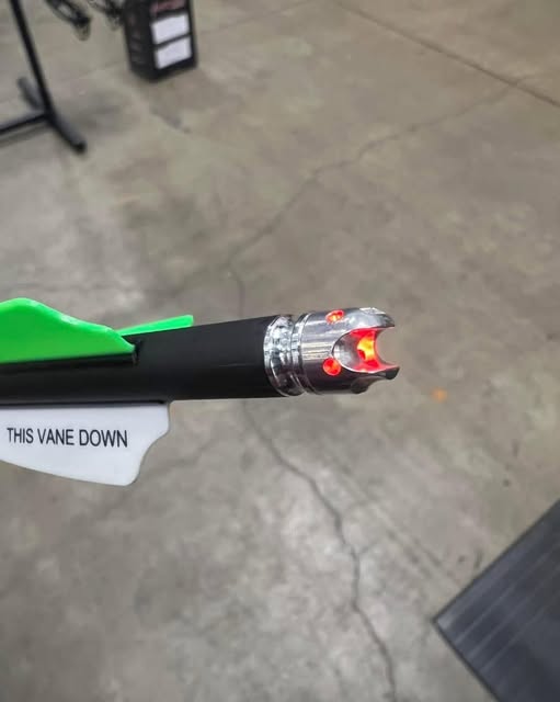 Parádním řešením je svítící končík pro tyto kuše, kde jsou baterie, dioda a spínač perfektně umístěny v přesně frézovaném končíku typu V-nock. Krásná práce.